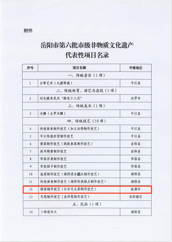 (通讯员 何莹莹)近期,岳阳市人民政府公布了岳阳市第六批市级非物质文化遗产代表性项目名录,共14个项目入选,临湘的绿茶制作技艺(白石毛尖茶制作技艺)名列其中。