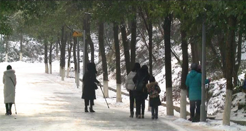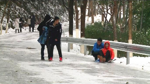 近日,一场瑞雪飘然而至,海拔500多米的五尖山国家森林公园银装素裹,晶莹剔透,宛若仙境。1月29日天刚放晴,众多市民便踏雪而上,尽情享受雪后的美景。由于公园山高,路面结冰,公园适时关闭了景区通道,但市民兴致不减,纷纷拍照留念,用相机、手机记录这一美景,还有一些市民用铁皮、纸板等做成了滑雪板,在下山公路上尽情享受滑冰的乐趣。