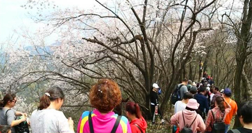 目前正是野樱桃花盛开之时,一簇簇、一丛丛,掩映重迭,争奇斗艳。那花开白如雪、红如霞,山间灿烂浪漫。风来花絮自由飘落,惚如仙境。如此美景,引得游人流连忘返。