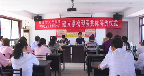 为深化公立医院改革,推进医疗资源纵向整合,5月17日上午,市人民医院与长安社区卫生服务中心正式签约,建立了我市首家医共体,此次组建医共体后,市人民医院将推进优质医疗资源纵向流动, 加强重点专科对口扶持、双向转诊,充分发挥医共体牵头医院的主体责任,加强对社区卫生院的技术指导和人员培训,提高社区卫生院诊疗水平,完善家庭医生签约服务,为人民群众提供安全、有效、方便、价廉的基本医疗服务。