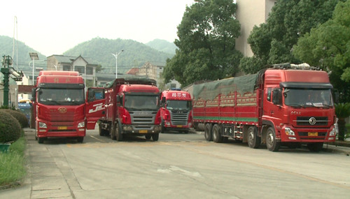 在中储粮临湘分公司收粮现场可以看到,送粮车辆正在整齐有序入库交粮。
