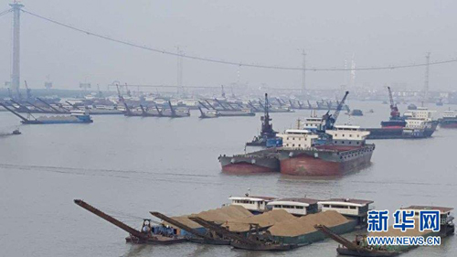 原来的水上砂石交易市场有许多从事砂石生意的船舶(资料照片)。新华社发(岳阳市地方海事局提供)