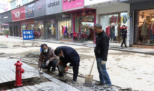 12月25日,记者在新天地商业街整体提质改造工程建设施工现场见到:寒冷的天气并没有影响施工进度,工人们正在全力以赴抢抓工期,整个工程建设预计在2019年1月初全部完工。