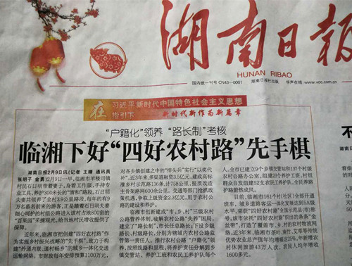 2月10日,《湖南日报》县市专版头条以【“户籍化”领养路长制考核 临湘下好“四好农村公路”先手棋】为题,对我市创新“市、乡、村”三级农村公路管养体制典型经验予以推介。