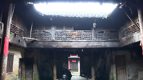 院子中间一个10多平方米的露天小天井,地面全部用麻条石铺砌,天井中央还有一个小水池,池底有泄水孔,据说底下有管道直通到山坡下的池塘。暗楼向着天井的栏杆均有雕花,刻有人物、龙凤、狮虎等,悬空下垂的短梁柱尾端,还雕着花篮。