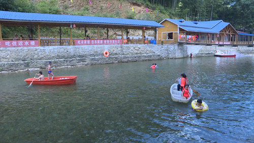 正在戏水的潘女士一家人从常德安乡专程赶来。因为听好友介绍,这里有千年古树、瑶文化、竹文化、酱文化等景点,集青山绿水、旖旎风光、民俗特色于一身,特意带着一家人来避暑。