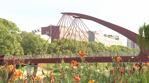 近日,长安河跨河人行天桥附属设施建设全部完成,正式开放通行。