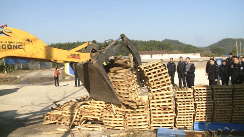 联合执法队分别从新屋村往中洲省界方向、018县道(羊定线)与京港澳高速交叉处沿县道往赵李桥方向进行清理,重点检查木材加工市场,是否存在销售带疫松木行为,对查获的疫松木按规定流程进行销毁处理。