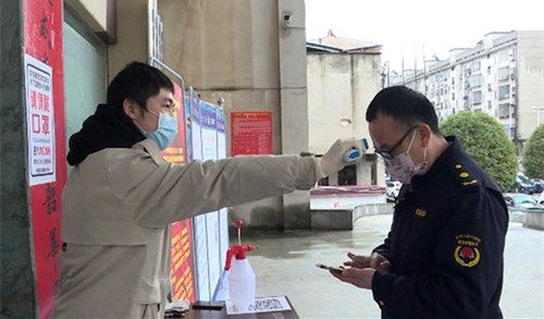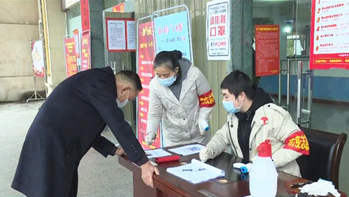 在市政务服务中心门前,工作人员正在对前来办理业务的市民进行询查。从进门起,每位办理业务的人都要经过登记详细信息、检测体温、扫二维码实名认证记录等一系列措施。