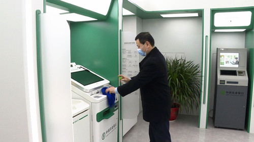 在自助终端设备处,每当有客户使用过设备后,工作人员都会用酒精擦拭消毒,同时,每台设备上都备有纸巾方便市民擦手,隔断了客户间接接触感染的途径。此外,营业网点每天都会进行三次全面消毒,大厅内客户数量达到5名时,工作人员就会控制人流量,避免人员聚集引发交叉感染。