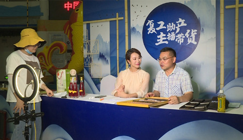 在湖南经视网络直播带货现场,熊丽和主播正在向直播间的网友介绍我市旅游景点、名优特产品、活动优惠力度等情况。