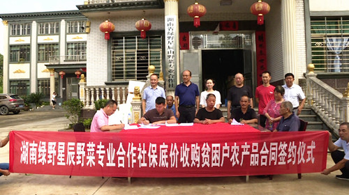 签约仪式上,湖南绿野星辰专业合作社总经理李黎与38户贫困户代表签订了《湖南绿野星辰专业合作社帮扶协议》,通过“合作社+贫困户”的经营模式,对贫困户种养的优质特色农产品进行保底价收购。