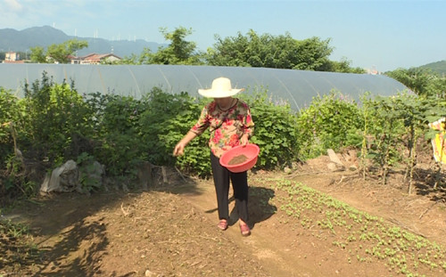 在长安街道杨田村中屋组,李春秀正在自家菜园里辛勤劳作,除草、翻地、浇水,播下白菜苔种子。