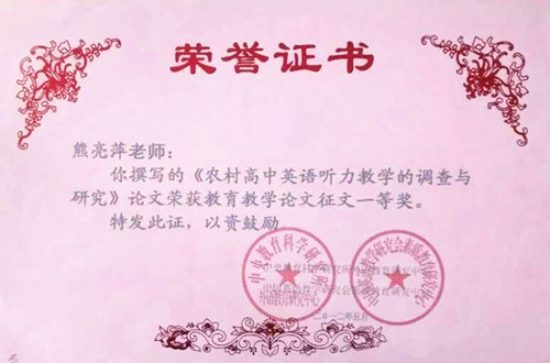熊亮萍从教25年来,始终坚守着一腔热忱一腔爱,眷恋农村教育的这片土地,眷恋农村的孩子们。工作中,她勇挑重担,爱岗敬业,为高校输送二本以上学生600余名,为清华、北大输送5名学生。工作之余,她不断加强业务学习,总结教学经验,多篇论文发表、获奖。其中《农村高中英语听力教学的调查与研究》一文荣获中央教育科学研究所外语教育研究中心论文评比一等奖。