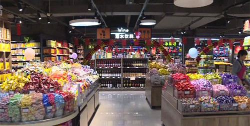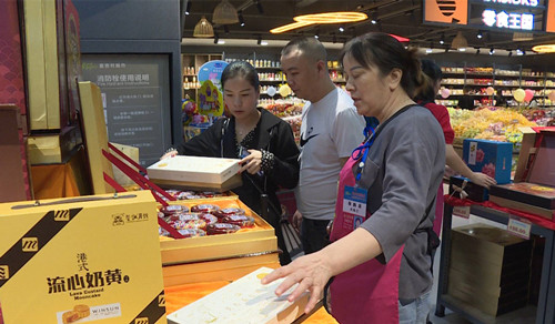 9月29日,记者在富食村白云湖旗舰店看到,卖场内节日氛围浓郁,商品琳琅满目,顾客络绎不绝。从粮、油、肉、蛋、菜、烟酒等生活必需品,到台湾的水果、德国的啤酒等进口商品持续热销。