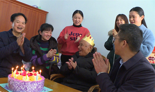 在市光荣院内,李国武为各位老人们分发了关爱大礼包,并与老人们促膝谈心、交流感情,现场一片欢声笑语,其乐融融,让老人们真正体会到社会大家庭的温暖。随后,李国武来到90岁高龄抗美援朝老兵余以近的住处,拉起了家常,在和老人的交谈中,得知老人今天90岁生日,大家纷纷表示,要为老人过上一个温馨、简单的生日,大家一起唱起了生日祝福之歌。