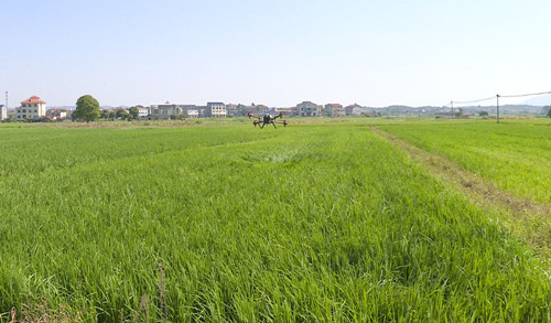 9月1日上午10点,在长塘镇双季稻高标准创建示范片,稻田排列整齐,随风摇曳。一台装满农药的无人机按照设定的路线,均匀喷洒着药剂。田埂上,农技专家正在指导农户进行田间管理。