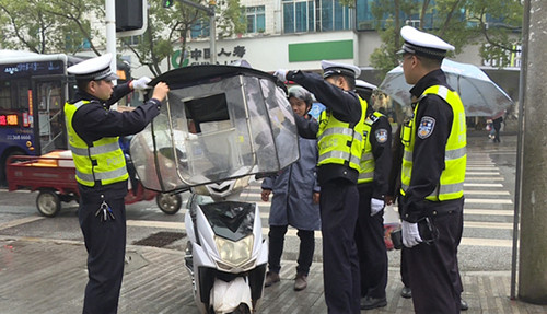 市公安交警大队城西中队副中队长游瑜:“自守护行动开始至今,城西中队所有民辅警每天早上七点半至晚上九点,对城区辖区摩托车进行整治,主要是对未戴头盔、非法加装雨伞、无牌无证的摩托进行查处。到目前为止,查处摩托车违法(未戴帽)4000多起,撤除非法加装雨棚400起,目前城区(整治)效果明显。”