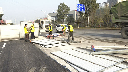 记者在长盛西路人社局前看到,施工人员正在拆卸道路施工围栏,并将金属框架抬至指定地点,进行统一装车。