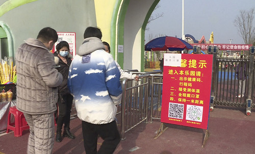 在五尖山欢乐世界门口入口处,工作人员设立了卡口,实行实名制入园游览,时刻提醒每一位游客扫码、戴口罩、测体温、保持安全距离。