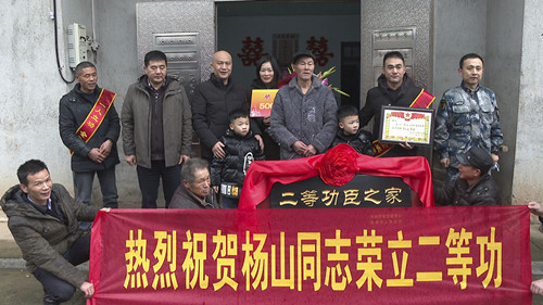 在喜庆的锣鼓声中,杜卫东一行将立功喜报、牌匾和奖金送到杨山手中,对杨山在部队荣立二等功表示祝贺,并详细了解军属家庭情况,对他们的付出给予充分肯定,感谢他们为部队、为祖国培养了优秀的军事人才,为临湘争得了荣誉。