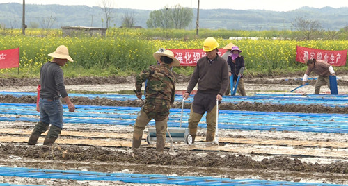 在江南镇鸭栏村种粮大户肖清君的早稻集中育秧点,村民们正在农技人员的指导下,摆盘、打泥、撒种、插竹架、盖薄膜,田间地头呈现一派繁忙景象。