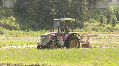 在羊楼司镇文白社区种粮大户李炎文的水稻种植基地,三台旋耕机开足马力,在水田里旋耕土地、犁地翻新。伴随着阵阵轰隆声,一块块水田被翻耕平整。