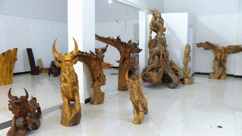 走进楠馨工艺品展览室,一件件巧夺天工的根雕工艺成品摆放整齐,飞禽走兽、仿古家具等应有尽有,栩栩如生,意韵深厚。