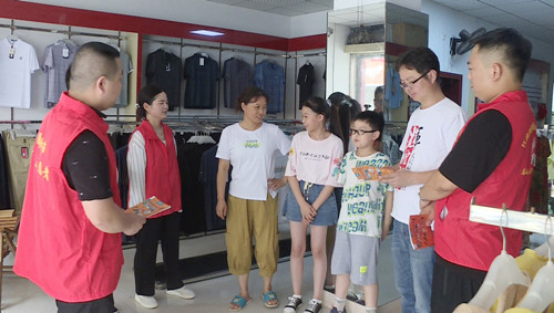 志愿者:“老板,天气热了,家里有小朋友,要让他注意点,不要到河边上去玩水。”