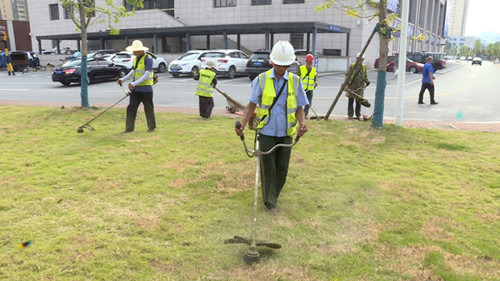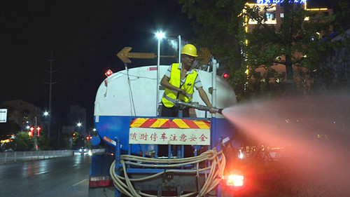 市园林绿化事务中心副主任徐秋明:“在高温期间我们采取早晚错峰+通宵模式对城区绿化进行抗旱浇水,修剪整形及除草保洁等系列工作。”