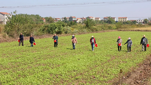 在江南镇江南村,村民们正在为油菜田施肥,油菜凭借“高颜值”横跨经济、旅游行业,不仅为村民们带来经济效益,还促进了乡村旅游发展。