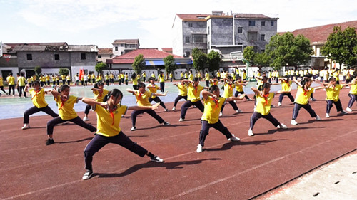 白羊田中学是一所乡镇校园武术段位试点学校,自2017年以来一直尝试将武术融入到课间操中。几年来,该校先后成功推出校园武术操《弟子规》《功夫扇》《少年强》。2017年10月,在湖南省校园武术段位赛中荣获一等奖。本学期开始,该校利用体育课进行《功夫扇》《少年强》教学,并融入学校训练、竞赛机制,对于促进学生知行合一、刚健有为、自强不息具有十分重要的意义。
