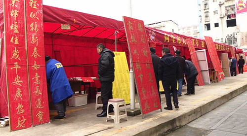 贴对联是中国的传统习俗。每年临近春节,部分书法爱好者都会齐聚在我市设置的对联临时便民销售点,现场手写春联。火红的帐篷将街边点缀得红红火火,营造出欢乐祥和的节日氛围。