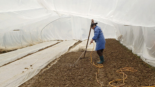 在聂市镇黄盖村,旋耕机在田间地头来回穿梭翻犁土地;旁边的大棚里,村民正在对土地进行浇水、覆膜。平整的土地、整齐的秧盘,为接下来的水稻种植打下了良好的基础。