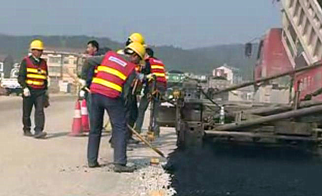 在施工现场,几辆满载沥青材料的货车配合着工程车,陆续将还冒着热气的材料平缓倒出,在场作业的工作人员在道路两旁辅助施工,然后由压路机将材料反复压实。随着工程车的推进,铺设好的路面显得十分平坦美观。