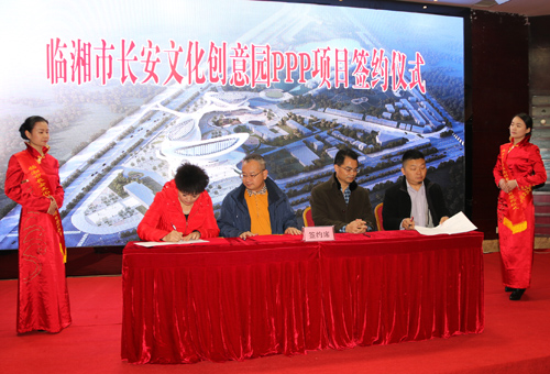 深圳市铁汉生态环境股份有限公司董事长刘水、广东省南兴建筑工程有限公司总经理林进宇、深圳市华纳国际建筑设计有限公司委托代理黄灿与我市市领导李美云、魏淑萍、余岳雄、魏新咏、廖祯祥、凌晓明、孙少游、曹小光、李垂利、熊丽、刘伯凤以及市直相关部门单位负责人参加签约仪式。长安文化创意园项目是我市采用PPP模式筹资5.7亿元,启动的首个产业项目。项目位于我市城西入口(107国道、长白路、临湘大道三路交汇处),规划用地约350亩,分为“一心三轴三片区”。项目旨在提升城市品位,改善人居环境,完善城市服务功能,整合文化资源,夯实经济基础,以公共文化服务带动文化产业,以文化产业反哺公共文化服务,助推我市城市旅游事业发展。该项目从今年年底动工建设,2019年正式投入使用。项目建成后将成为湘北地区最大的综合性文化产业示范园和省级公共文化服务体系建设示范基地。
