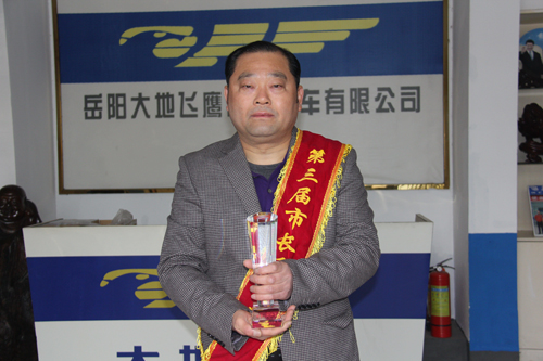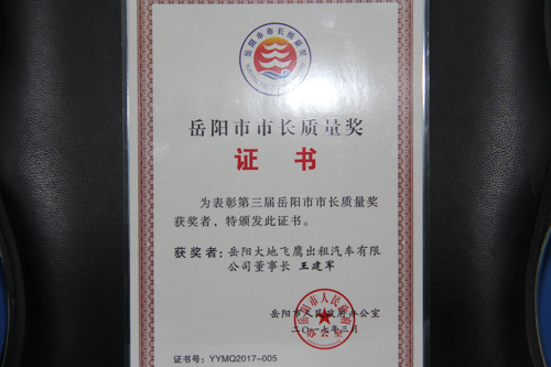 在3月15日召开的第三届岳阳市市长质量奖颁奖暨质量强市战略推进会上,岳阳市5家单位和2名个人获得第三届市长质量奖。其中,大地飞鹰出租车有限公司董事长王建军荣获“第三届岳阳市市长质量奖”获奖个人。