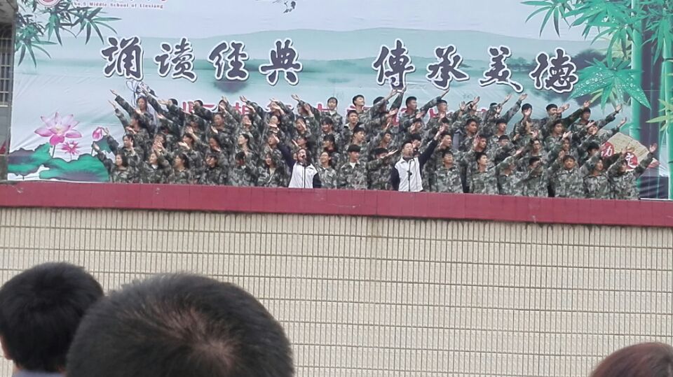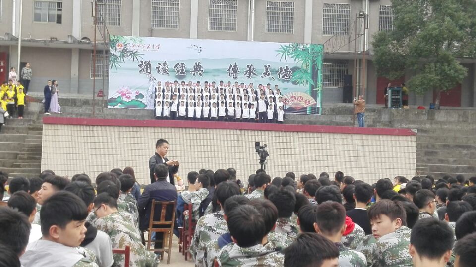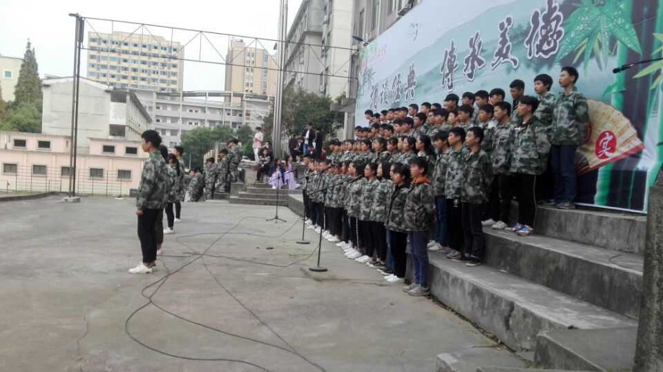 两千学生齐聚操场,衣着整齐,精神抖擞,他们从先秦的《三字经》、《弟子规》到大唐的《蜀道难》、《将进酒》再到现代的《沁园春 雪》、《致橡树》一路吟诵而来,给全校师生带来了一场经典文化盛宴,引领我们进行了一次穿越之旅。广大学生在这次诵读经典中感受到了经典文化的博大精深,思想上得到很好的洗礼。