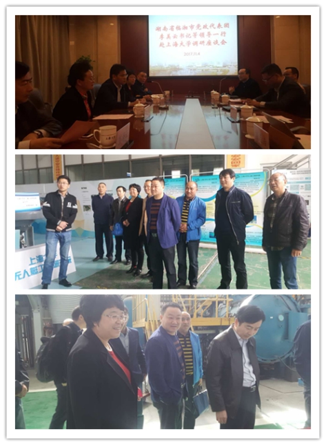 党政代表团一行先后实地参观了上海大学分析测试中心、无人艇工程研究院、高温叶片合金车间等科研平台,并与上海大学相关负责人进行了座谈。座谈会上,临湘市委书记李美云、市长魏淑萍、上海大学创新管理部部长罗均等领导代表两地就高新技术项目合作进行了洽谈交流,并就构建“政、产、学、研”体系,在临湘建立科技转移基地达成初步意向。