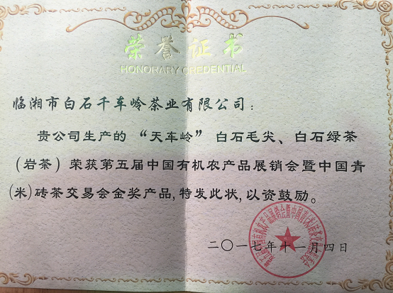 11月5日,由中国商业联合会、中国城市商业网点建设管理联合会、中国茶叶流通协会联合主办的第五届中国有机农产品展销会暨中国青(米)砖茶交易会在湖北省赤壁市落下帷幕,湖南临湘市白石千车岭茶业有限公司生产的“天车岭”白石毛尖、白石绿茶荣获金奖。这是该公司继去年白石毛尖获得第四届中国有机农产品展销会暨中国青(米)砖茶交易会金奖之后再获殊荣。该公司是本届十家获得金奖企业的唯一一家湖北省外企业。(刘晓瑜)