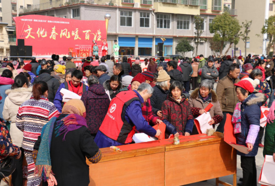临湘市委、市政府精心统筹,市委宣传部统一部署,全市文旅广新系统充分发挥职能,与各相关部门通力协作,充分利用自身资源优势,举办送图书、文艺演出、戏剧展演、创建成果展览、书赠春联、读书讲座、科技卫生等“九下乡”及其他系列活动,早早将祝福、吉祥和年味送进千家万户。当天,岳阳市文广新局副局长甘学红、临湘市文旅广新局局长陆如勇及党组其他领导、桃矿街道工委书记刘庆明及街道其他领导率员送文艺节目12个、图书2万册、大米20包、食用油20瓶、春联1000多幅,送文艺节目和戏剧展演的现场喜气洋洋,送成果展览和书赠春联的操场边笑声朗朗,贫困户家中,文化志愿者为他们搞卫生,送慰问品,一派热火朝天的景象;敬老院里,爱心使者帮老人理发、剪指甲、为老人讲故事,遍布和谐美好的气氛;人们笑啊、唱啊、跳啊,活动现场成了一片欢乐的海洋……