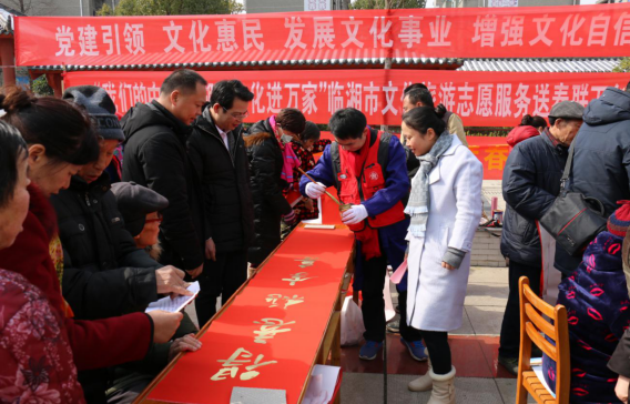 “我们的中国梦 湖湘文化进万家”临湘市文化旅游志愿服务送春联活动现场。