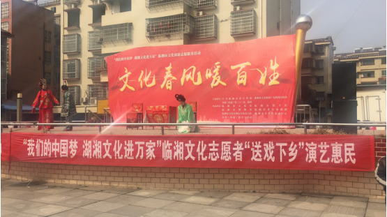 “百花争艳欣望江山千里秀,万民欢庆齐颂祖国万年春”。2018年春节前,剧团紧紧围绕市委市政府的中心工作,积极落实市文旅广新局的主要工作,以全省开展“我们的中国梦,湖湘文化进万家”系列活动为契机,开展了文化志愿小分队“送戏下乡”演艺惠民系列活动。