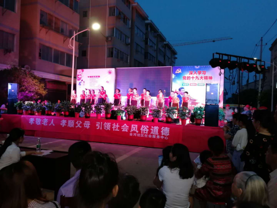 本场演出由五里街道和市文旅广新局文化志愿者精心编排,旨在共庆“母亲节”,用文艺形式歌颂母爱,传播美好风尚,丰富群众文化生活。活动在广场舞《党啊亲爱的妈妈》中徐徐拉开大幕,小品《娘亲》、花鼓戏《刘海砍樵》等使观众大饱眼福,唢呐独奏《黄土高坡》将晚会推向高潮,17个节目中,金河社区表演的散文朗诵《母爱》和男声独唱《最美的歌送给妈妈》温暖着大家的心,让在场观众感受到了母爱的伟大。整台晚会表演形式多样,内容丰富,不时赢得观众阵阵掌声。演出结束了,现场观众还不愿离开,他们说,看到这些题材的节目打心眼里觉得亲切,并拉着文化志愿者的手说,希望你们今后多到我们小区来演出,看到你们感到格外亲切。