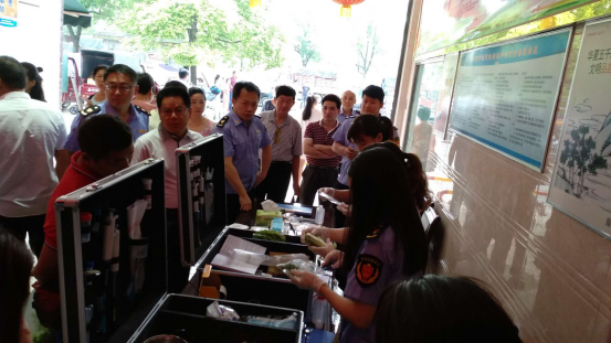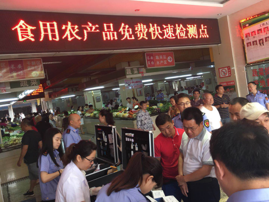 6月14日,为让广大市民渡过一个温馨愉快的端午佳节,有效守护市民“舌尖上的安全”,临湘市食药工商质监局派出专业技术人员对长安集贸市场食用农产品免费进行专项快速检测。副市长刘如乐参加行动,市食药工质监管局局长何碧辉、副局长余永宏现场陪同讲解。