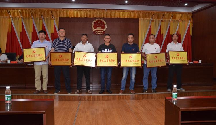 镇领导为获得“先进基层党组织”荣誉的七个村(社区)授予奖牌