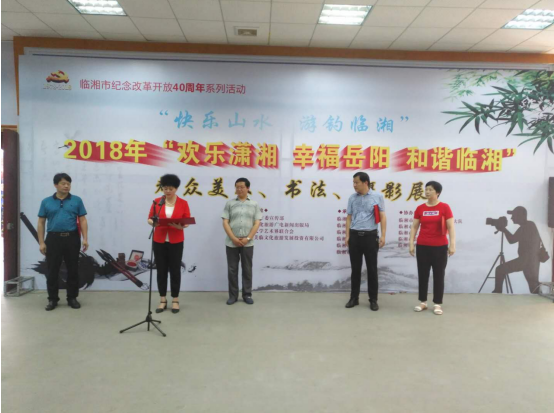(张日平 姜 青)8月8日,纪念改革开放40周年系列活动,“快乐山水•游钓临湘”2018年“欢乐潇湘•幸福岳阳•和谐临湘”群众美术、书法、摄影展开展仪式在临湘市博物馆隆重举行。本次活动,由临湘市文化馆、市博物馆、市美术馆、市美术家协会、市书法家协会、市摄影家协会共同承办,市文化市场综合执法大队、市图书馆、市花鼓戏剧团、市影剧院、市青少年活动中心协办。临湘市人民政府副市长熊丽、市委宣传部常务副部长胡子贵、市文旅广新局全体党组领导及社会各界人士近1000人参加开展仪式。