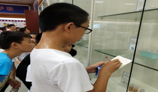 学生们认真辨别陈设在玻璃柜里的各种仿真毒品和制毒工具