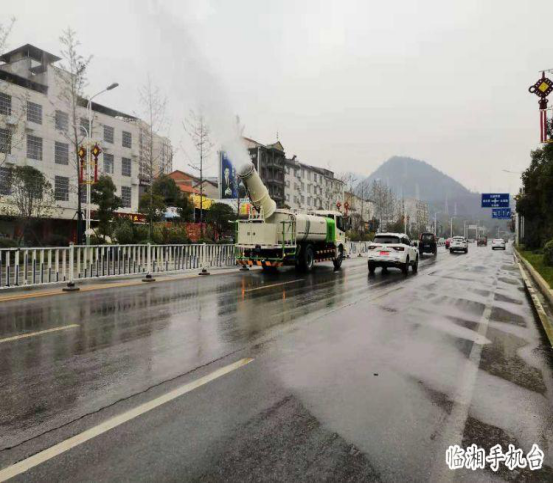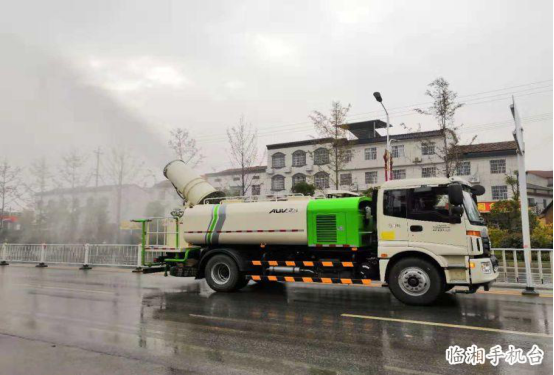 ▲雾炮车作业中。 雾炮车俨然成了马路上的一道风景线。