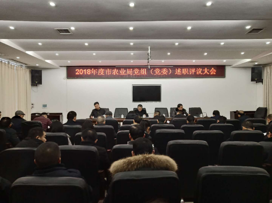为很好地总结2018年工作成绩,查摆问题,谋划2019年工作,1月11日,2018年度市农业局党组(党委)述职评议大会顺利召开。局党组(党委)全体班子成员、党支部书记、站股室及二级机构负责人、党员群众代表80余人参加了会议。